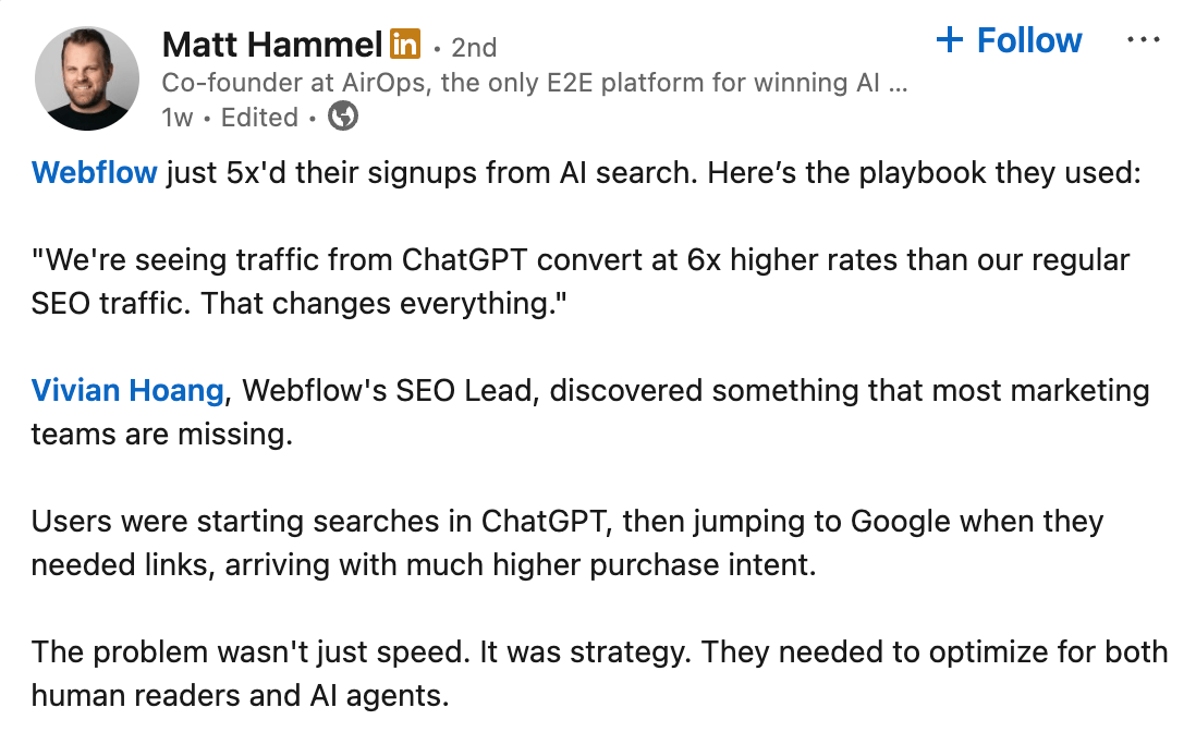 Webflow boosted signups from ChatGPT and Perplexity by 5x and those leads converted 6x higher than their regular SEO traffic (Webflow Case Study).