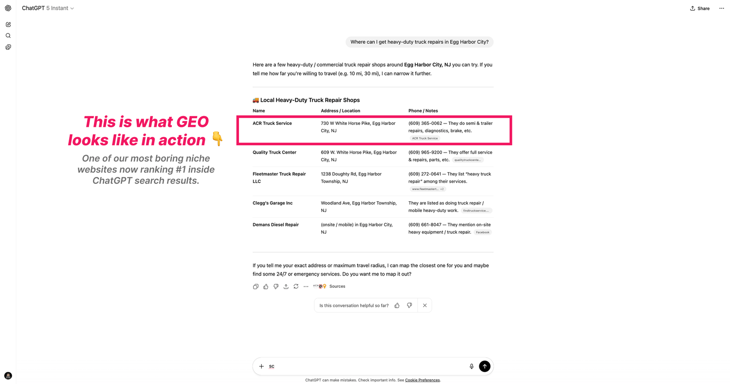 from ACR Truck Service, a small local shop suddenly showing up in ChatGPT results within a week..