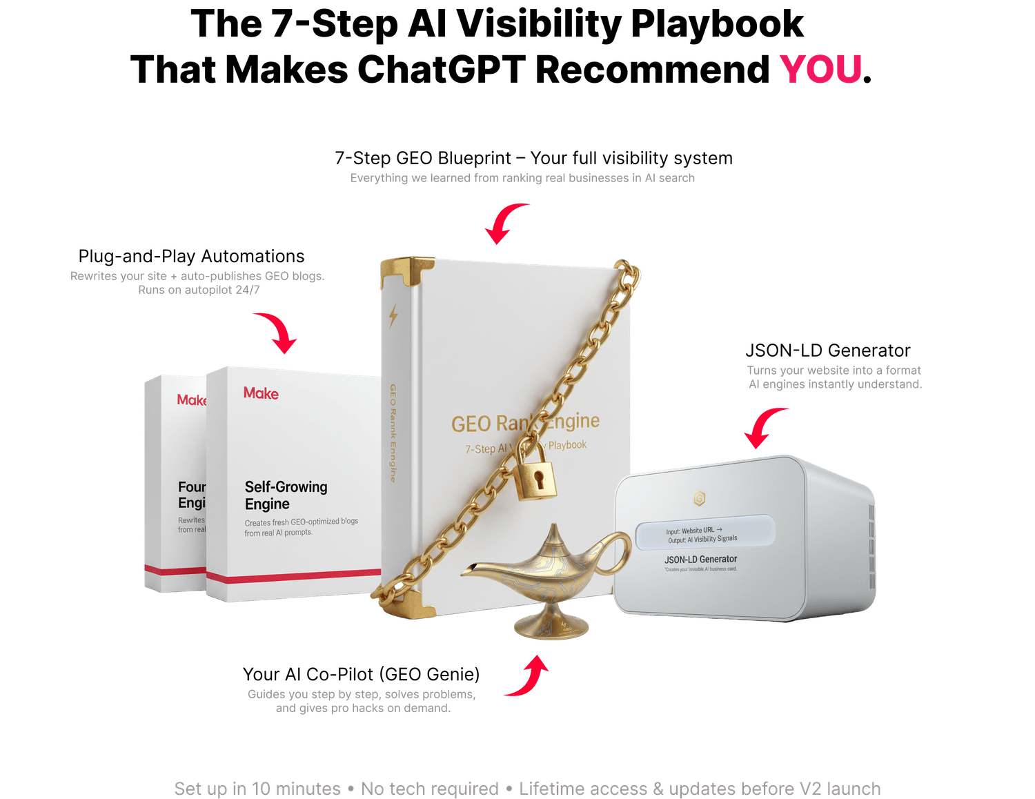 The first 100 get lifetime access, future updates, and free access to the full AI GEO Engine when it launches.