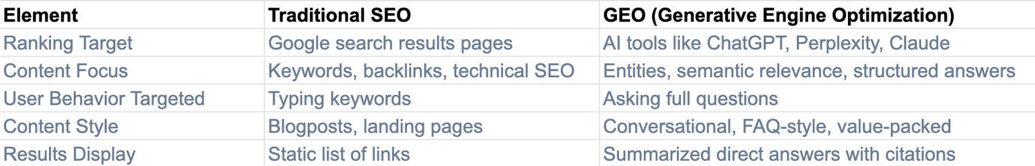 While traditional SEO focuses on ranking on Google using keywords, backlinks, and technical structure, GEO (Generative Engine Optimization) is the strategy of optimizing your content to appear in AI-generated responses from tools like ChatGPT, Perplexity, and Claude. It focuses more on semantic authority, structured answers, and entity-rich, helpful content that AI models are likely to surface.